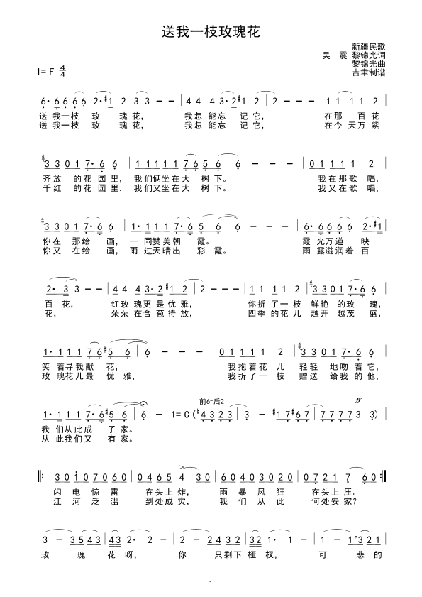 《送我一枝玫瑰花(新疆民歌)》简谱