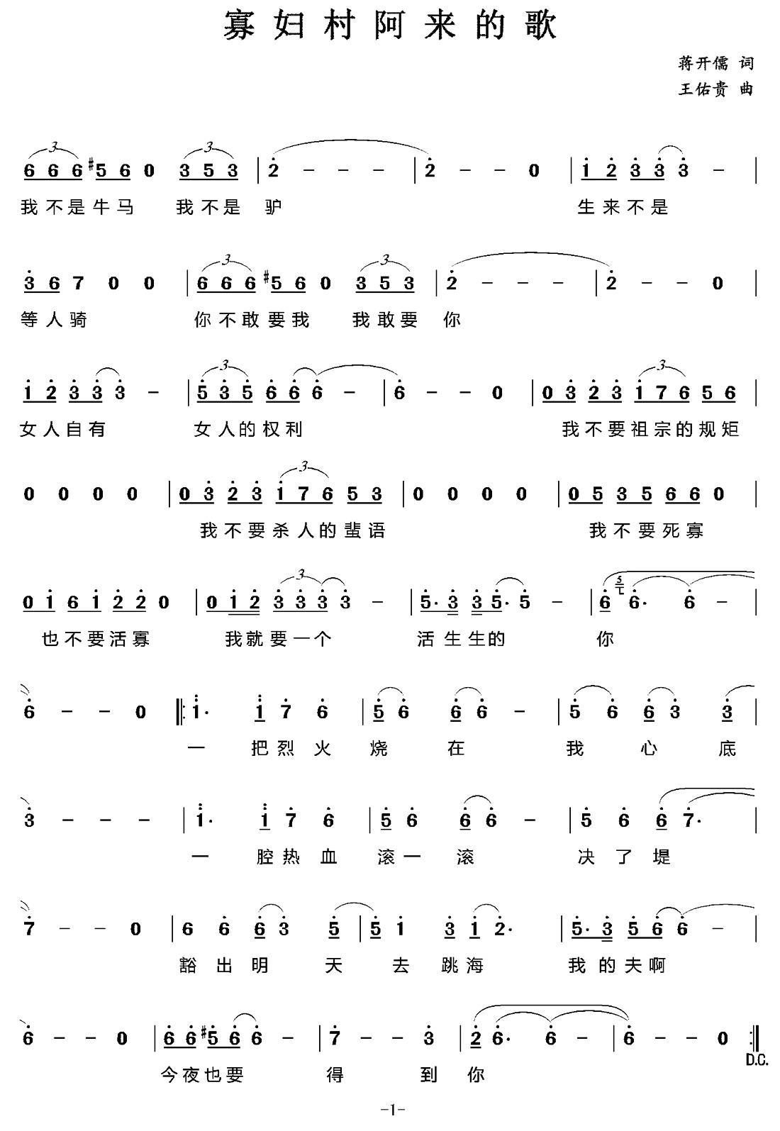 《寡妇村阿来的歌》简谱 王佑贵