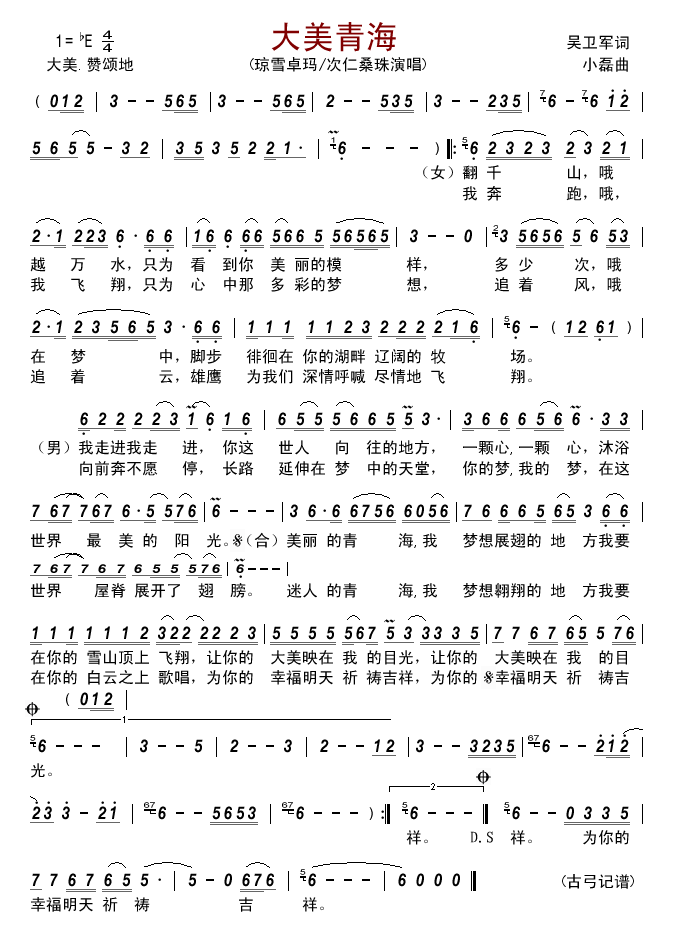 《大美青海》简谱 琼雪卓玛/次仁桑珠