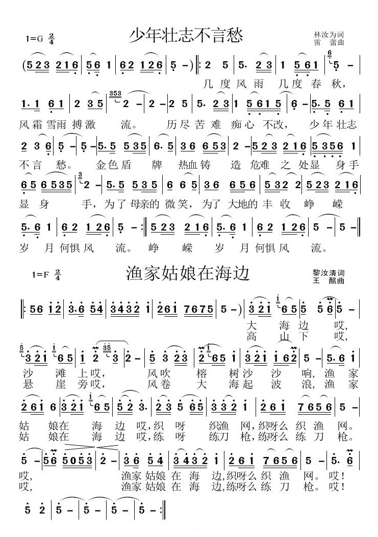 《少年壮志不言愁、渔家姑娘在海边》简谱