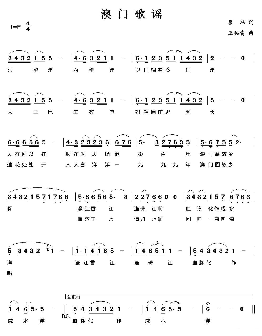 《澳门歌谣(瞿琮词 王佑贵曲)》简谱