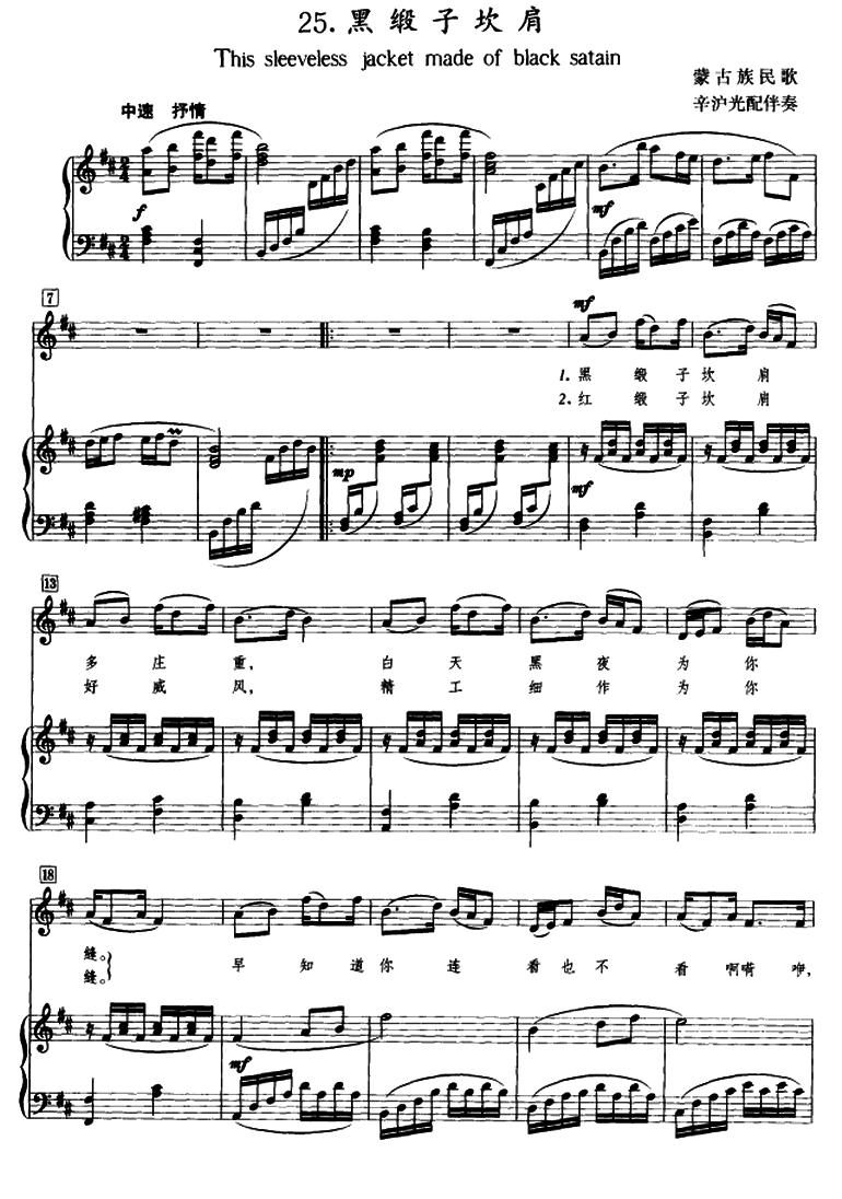 《黑缎子坎肩 (正谱)》简谱 蒙古族民歌 辛沪光配伴奏
