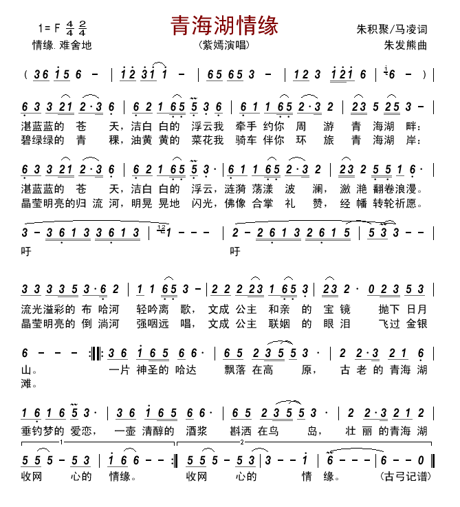 《青海湖情缘》简谱 紫嫣