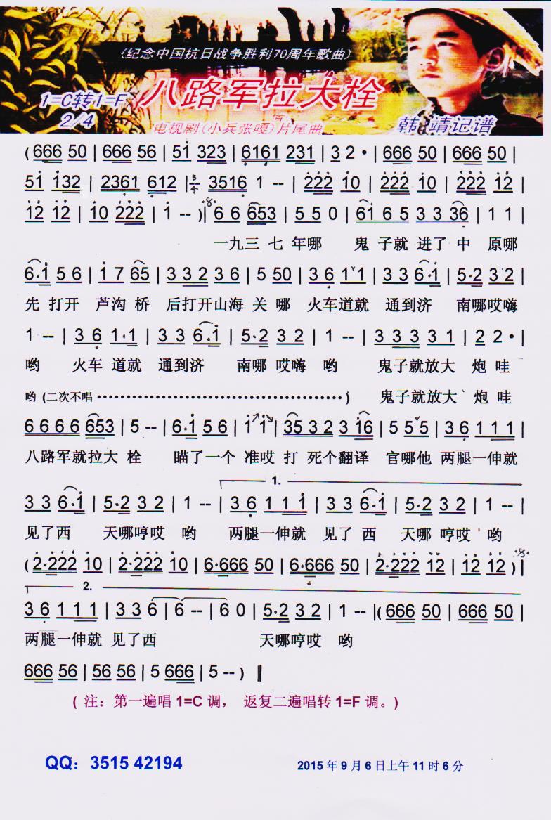 《八路军拉大栓【彩谱】》简谱 山东民歌