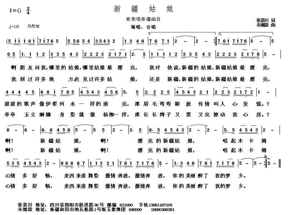 《新疆姑娘(张景川词 朱继霖曲)》简谱