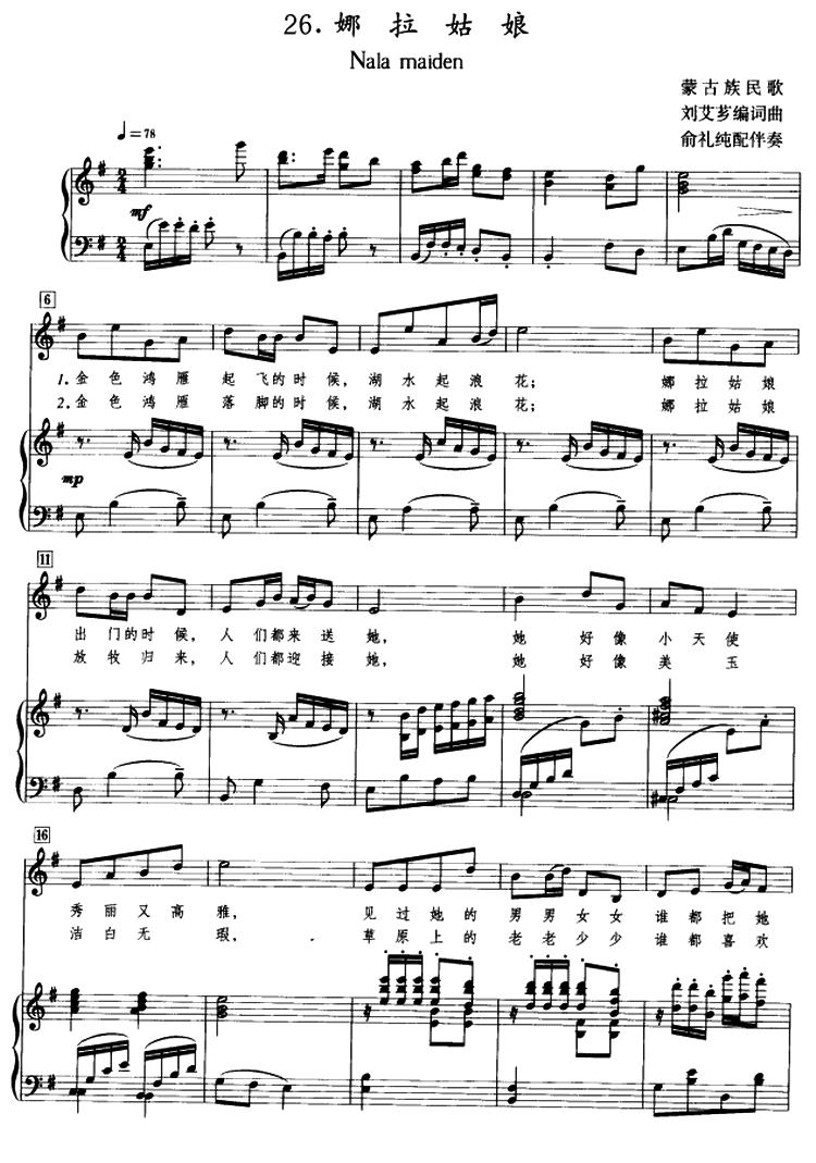 《娜拉姑娘 (正谱)》简谱 蒙古族民歌 刘艾芗编词曲 俞礼纯配伴奏