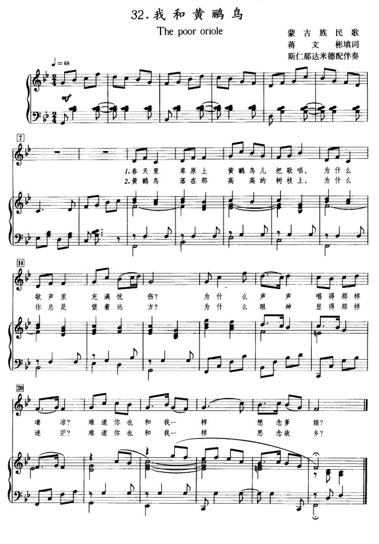 《我和黄鹂鸟 (正谱)》简谱 蒙古族民歌 、斯仁那达米德配伴奏