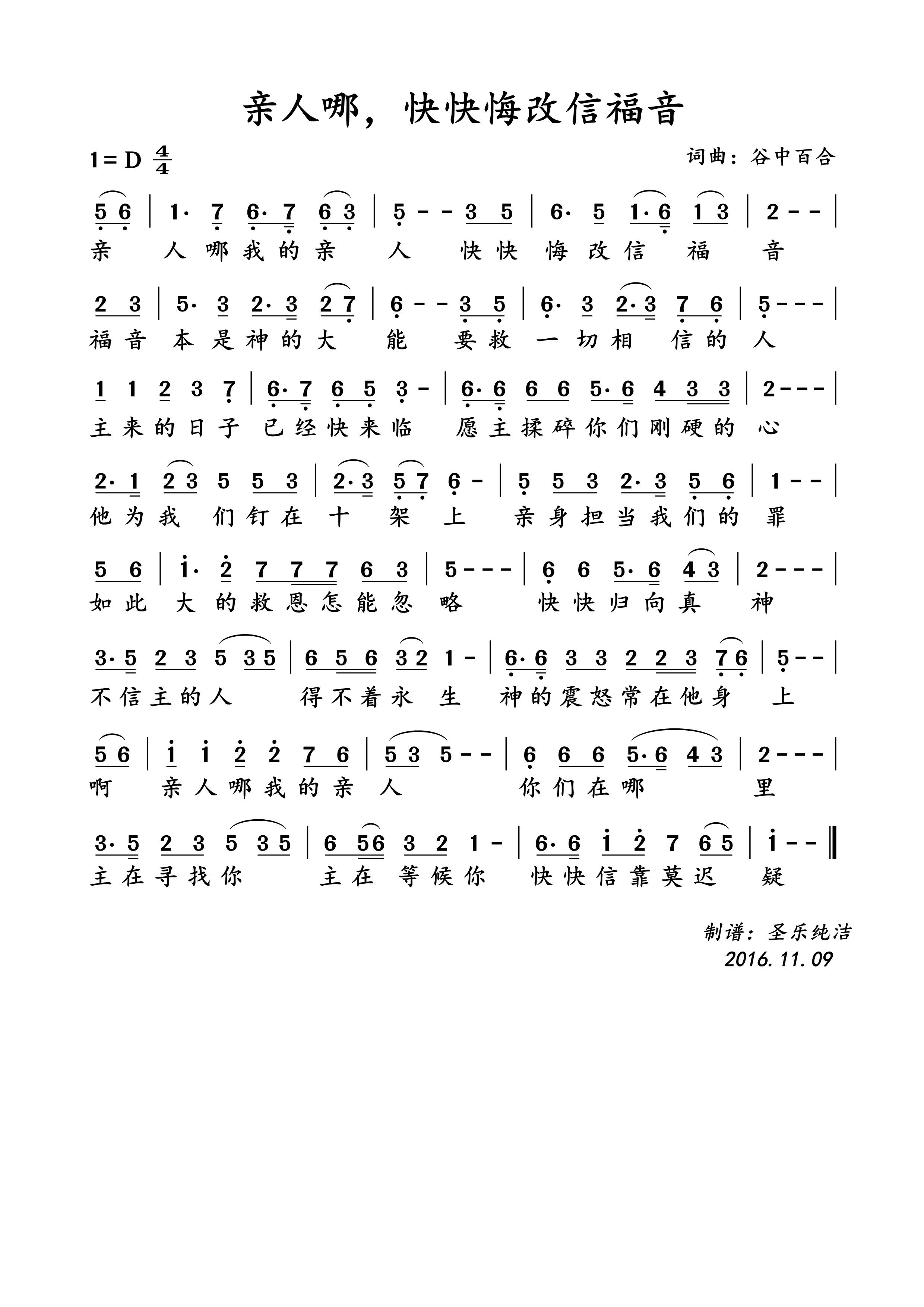 《亲人哪,快快悔改信福音》简谱 谷中百合