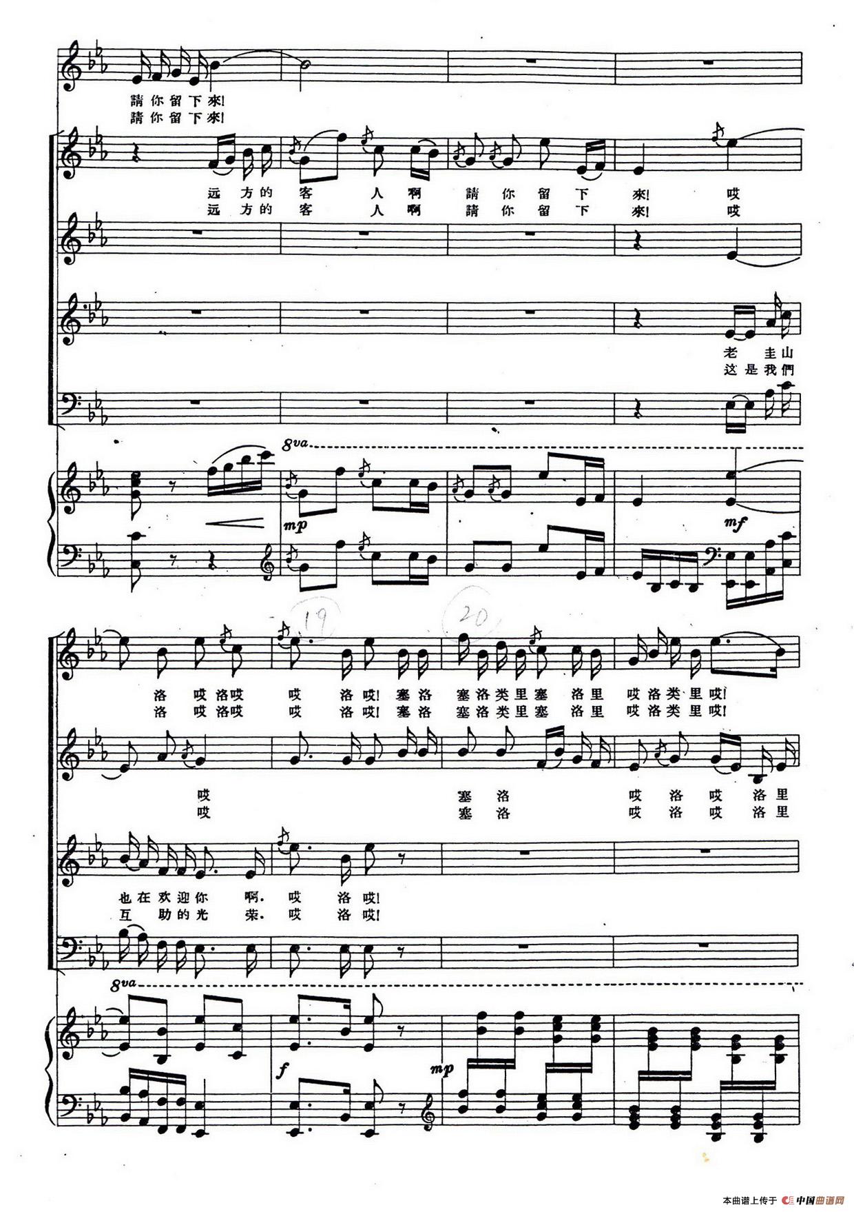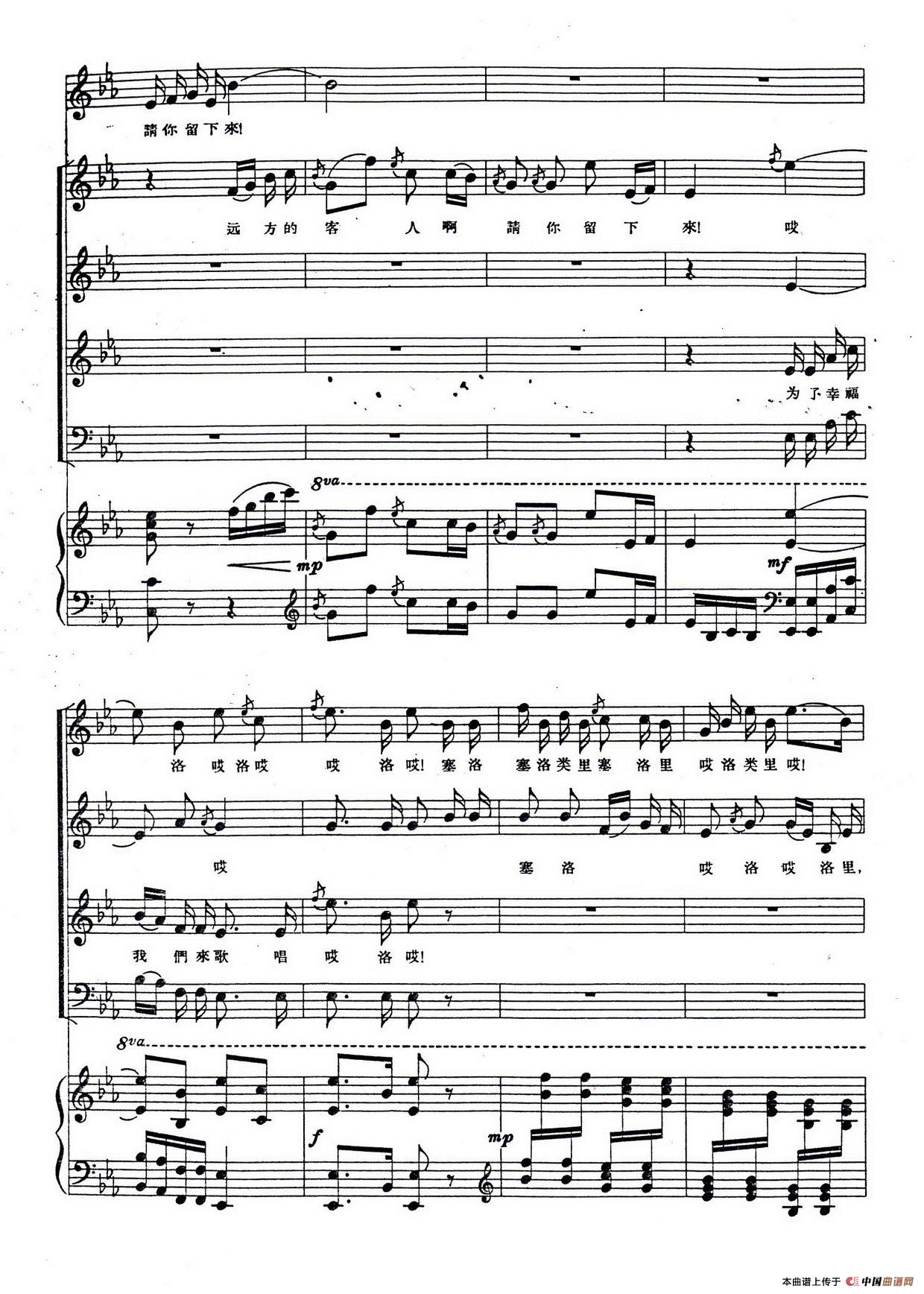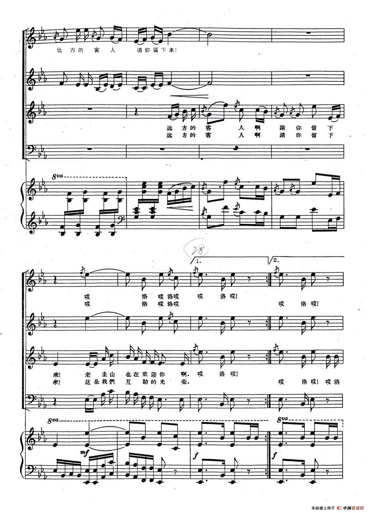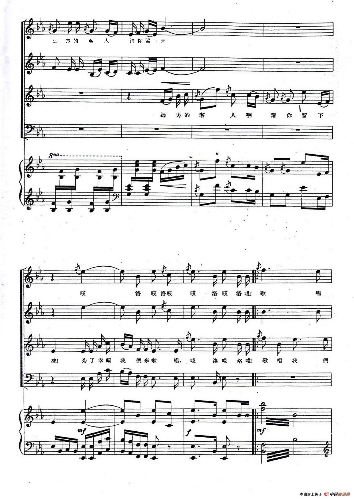 《远方的客人请你留下来(正谱)》简谱 1.辽宁通信之声合唱团 2.中央民族歌舞团