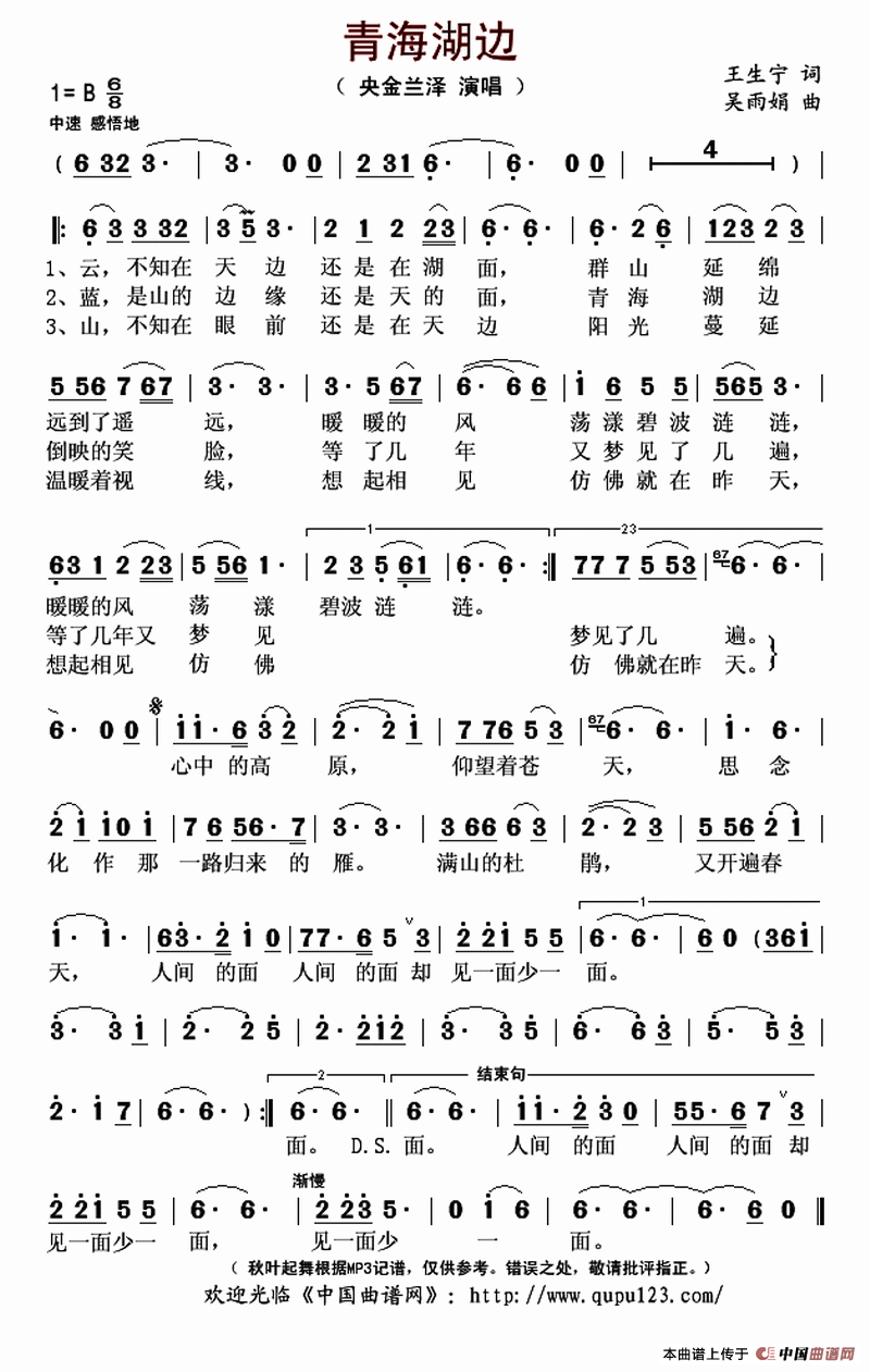 《青海湖边》简谱 央金兰泽