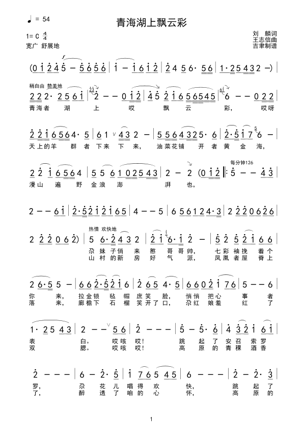 《青海湖上飘云彩》简谱