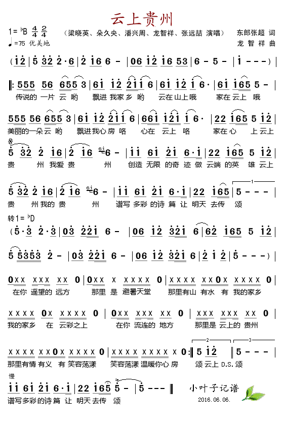 《云上贵州》简谱 梁晓英、朵久央、潘智祥