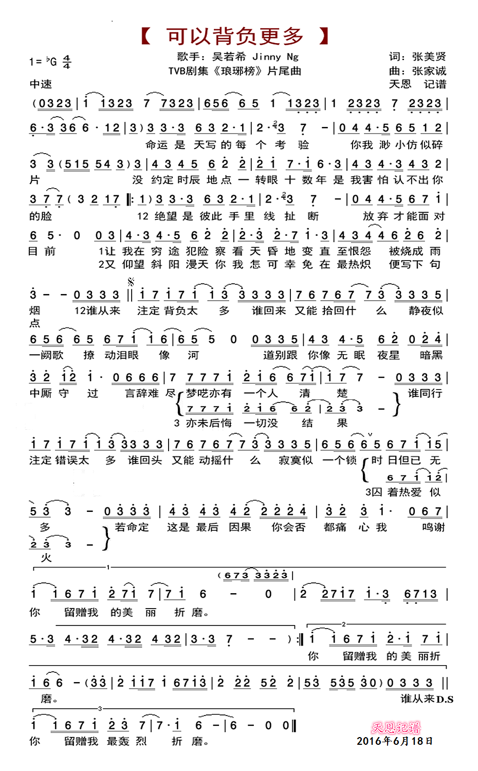 《可以背负更多(剧集 "琅玡榜" 片尾曲)》简谱 吴若希 Jinny Ng
