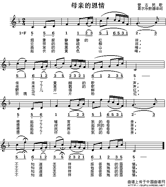 《母亲的恩情(蒙古民歌、线简谱混排版)》简谱