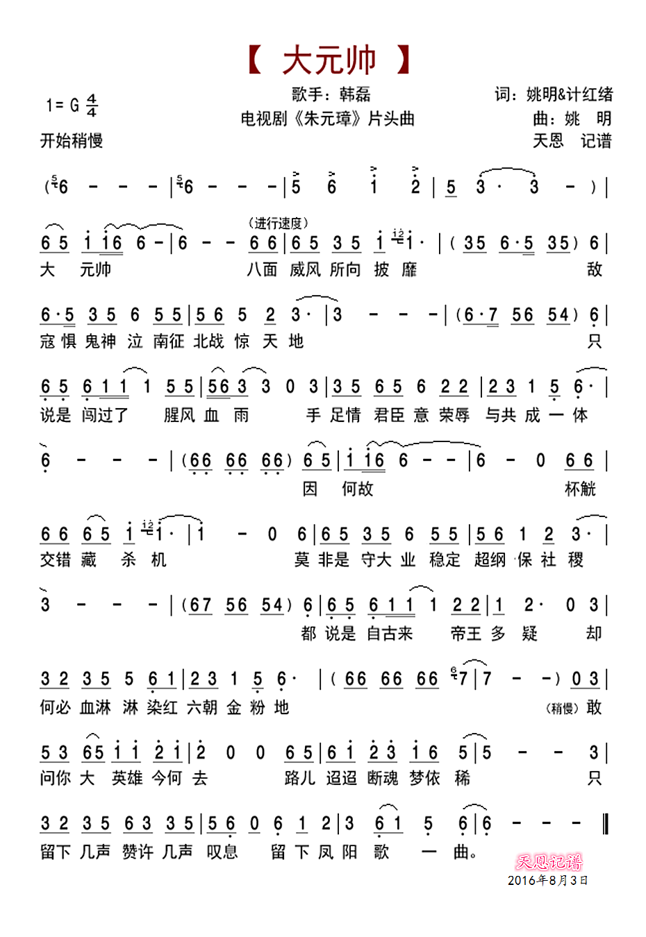 《大元帅(电视剧《朱元璋》片头主题歌)》简谱 韩磊