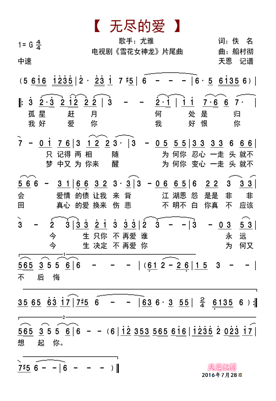 《无尽的爱(电视剧《雪花女神龙》片尾曲)》简谱 尤雅