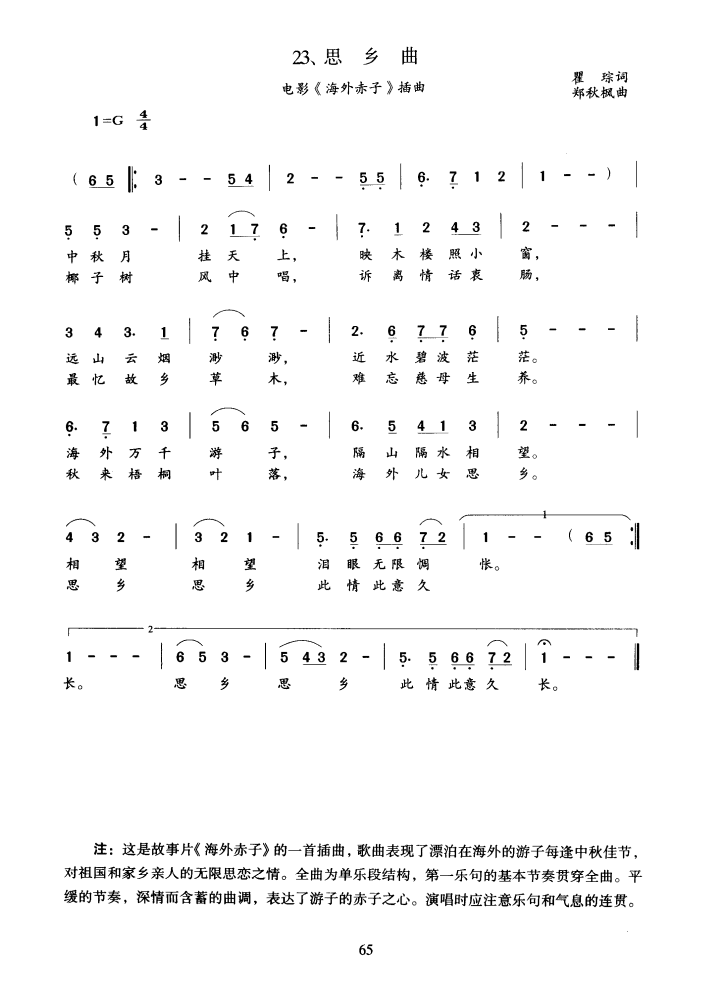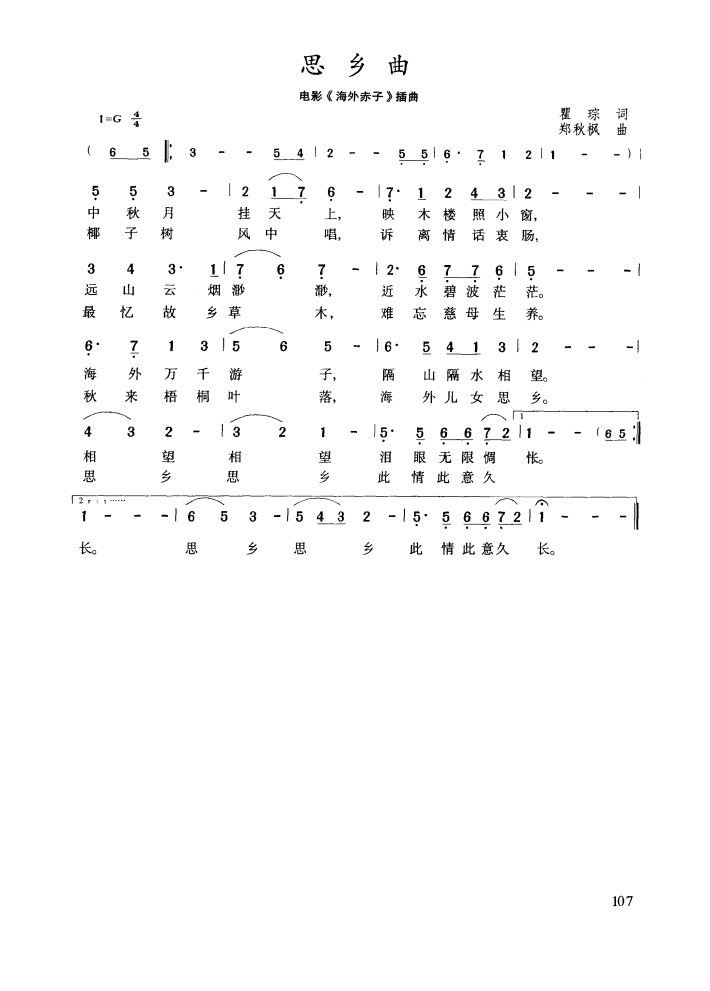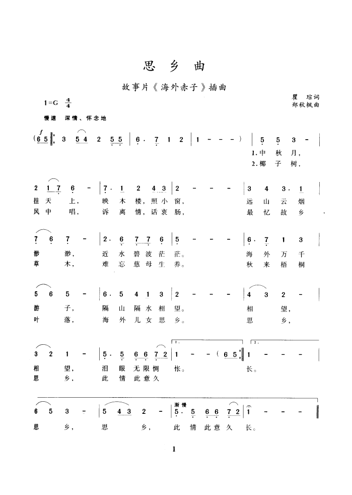 《思乡曲(电影《海外赤子》插曲)》简谱 罗天婵