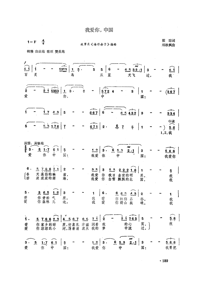 《我爱你中国(电影《海外赤子》插曲)》简谱 叶佩英