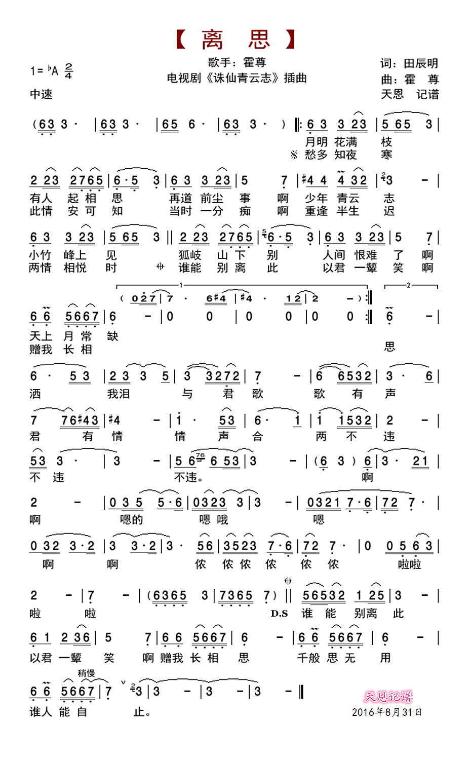 《离思(电视剧《诛仙青云志》插曲)》简谱 霍尊