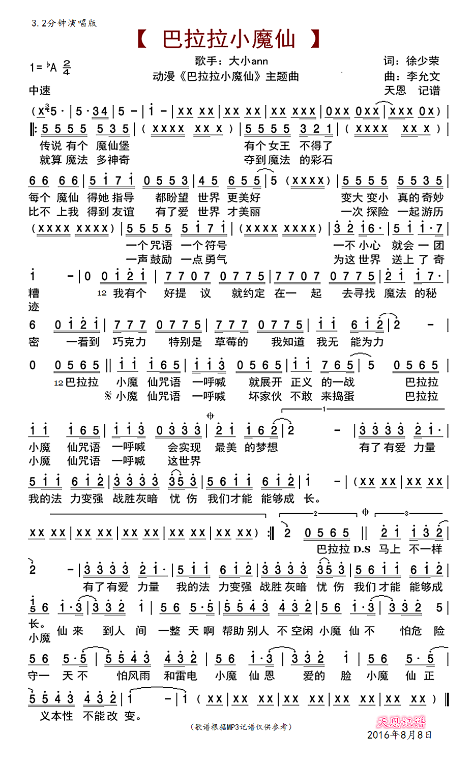 《巴拉拉小魔仙3.2(动漫《巴啦啦小魔仙》主题曲)》简谱 大小ann