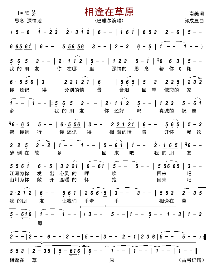 《相逢在草原(南美词 郭成显曲)》简谱 巴雅尔