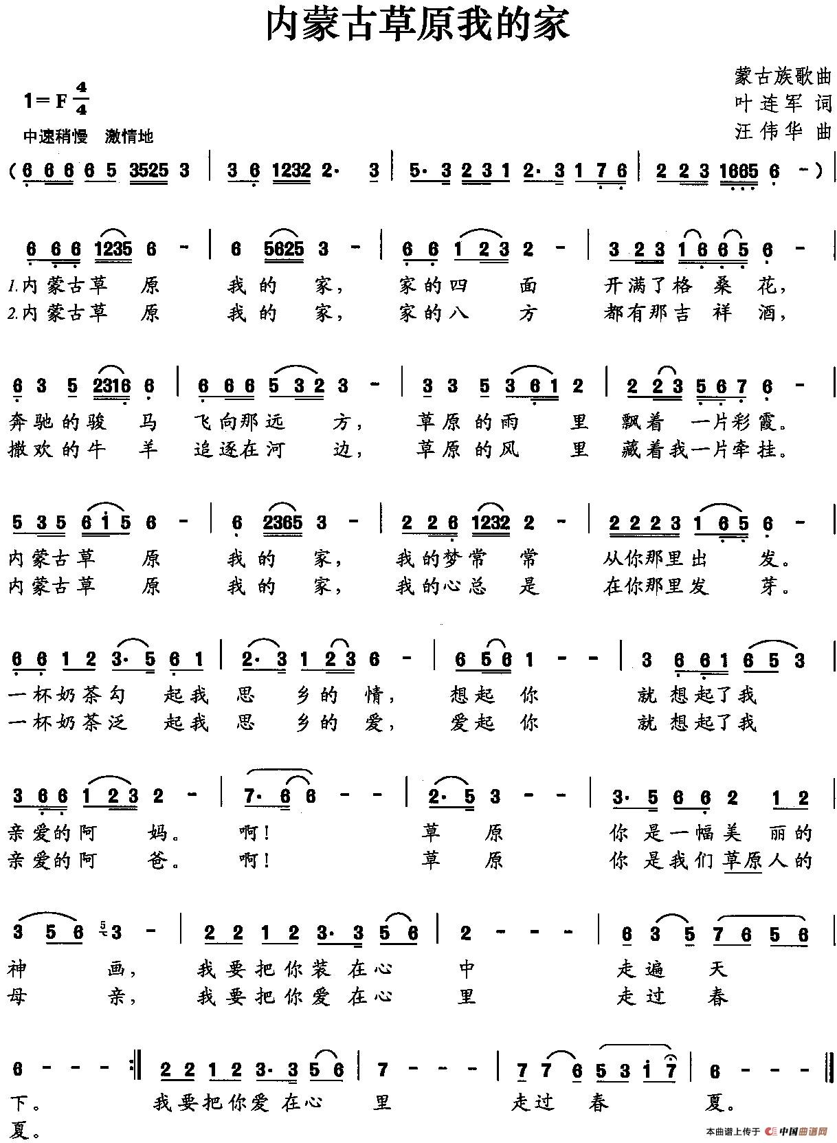 《内蒙古草原我的家》简谱