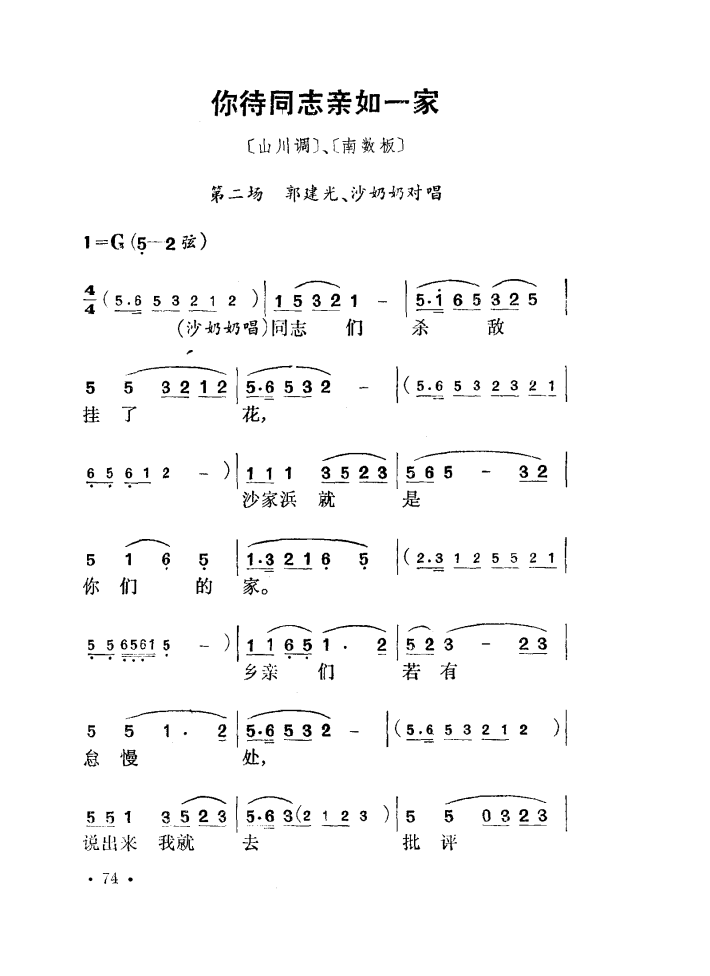 你待同志亲如一家(湖南花鼓戏《沙家浜》选段)简谱
