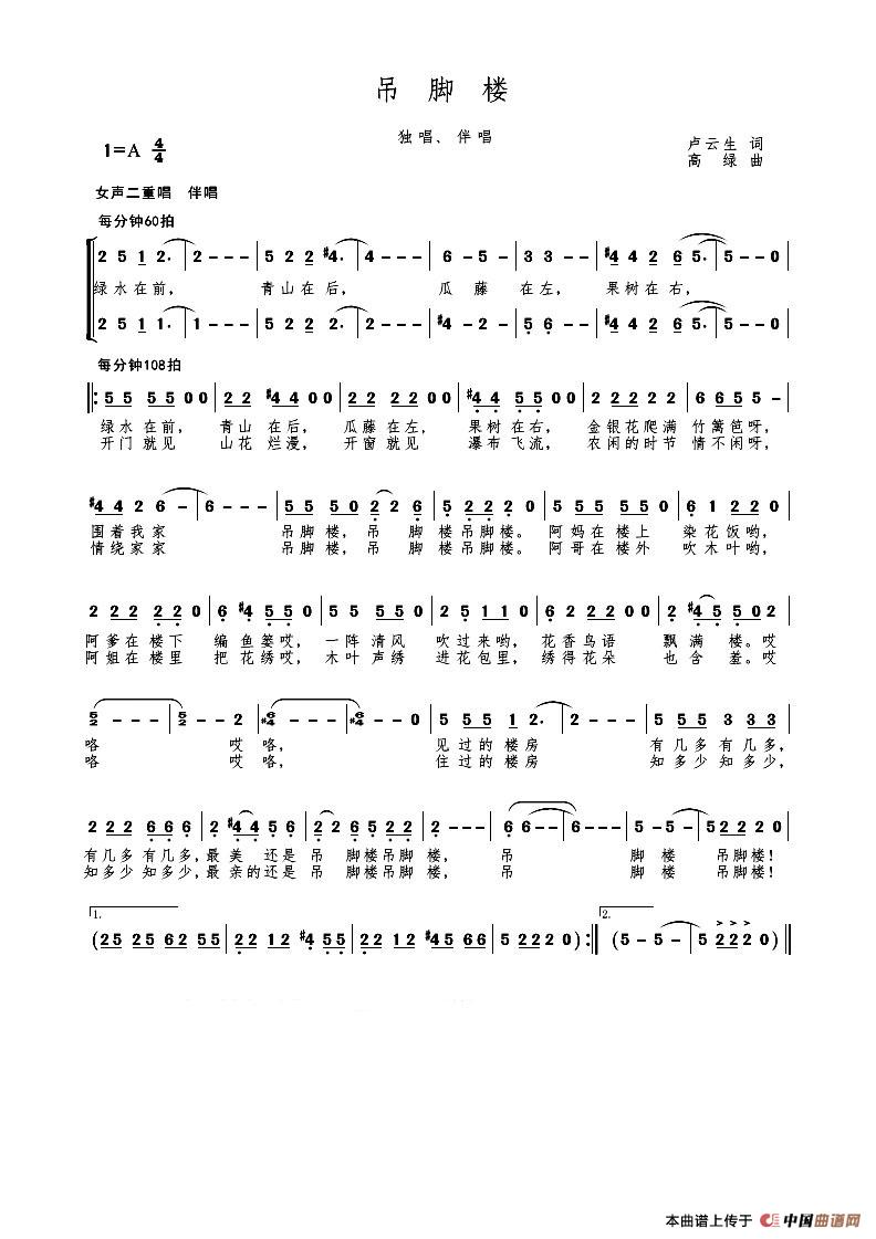《吊脚楼》简谱