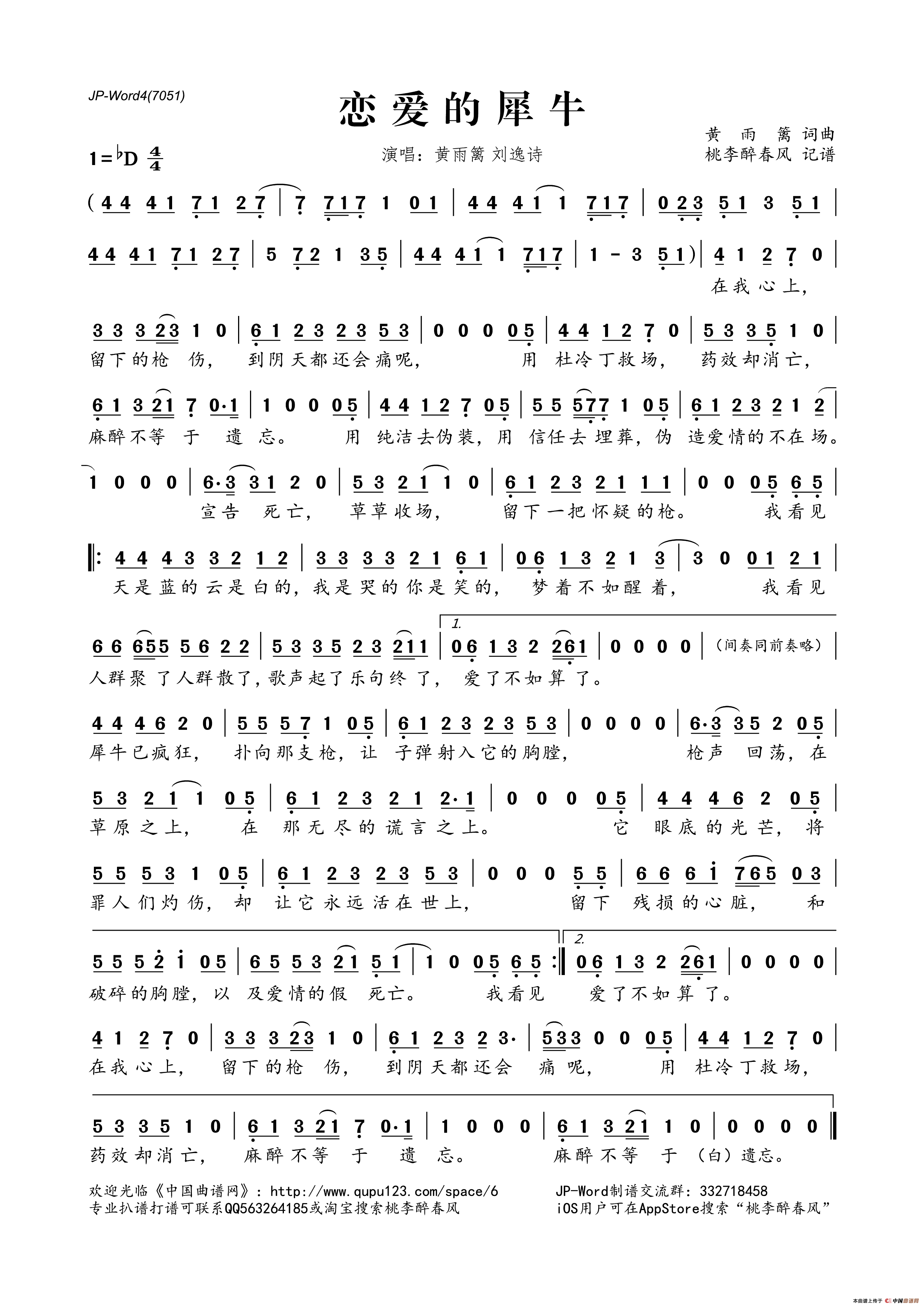 《恋爱的犀牛》简谱 黄雨篱 刘逸诗