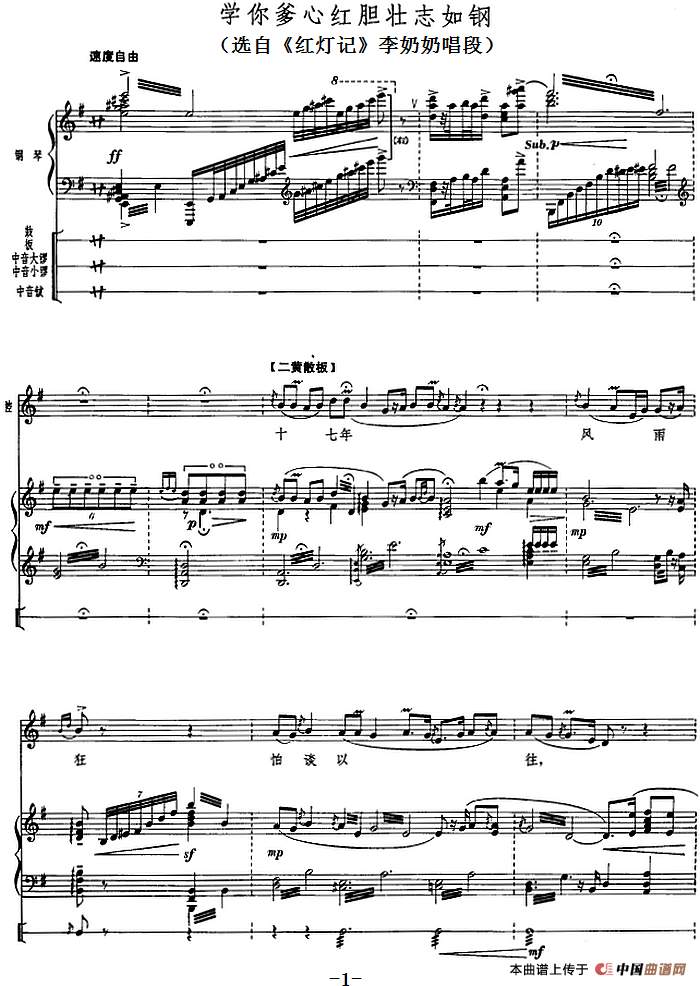 《钢琴伴唱京剧《红灯记》:学你爹心红胆壮志如钢(李奶奶唱段)》简谱