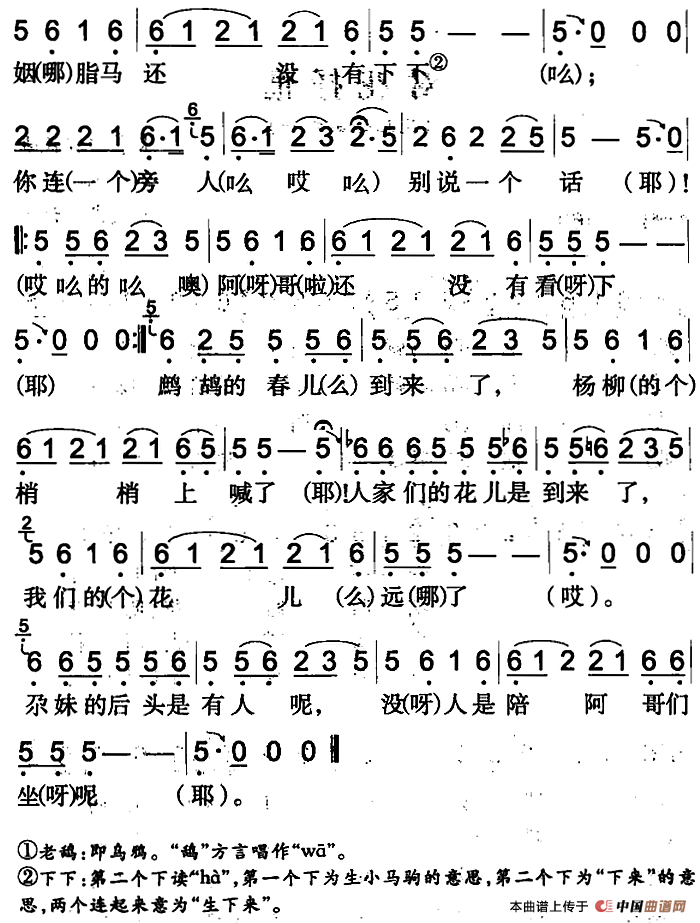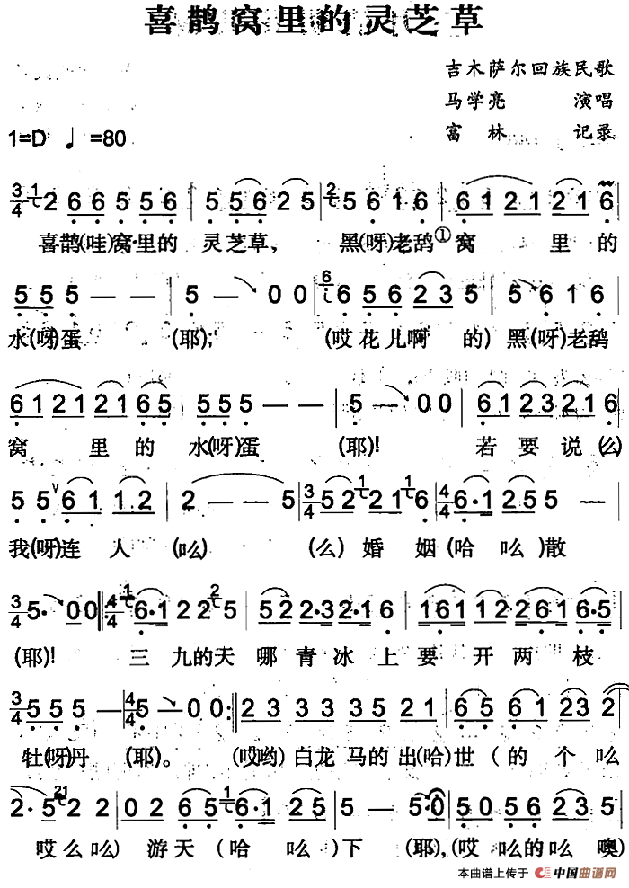 《喜鹊窝里的灵芝草(吉木萨尔回族民歌)》简谱 马学亮