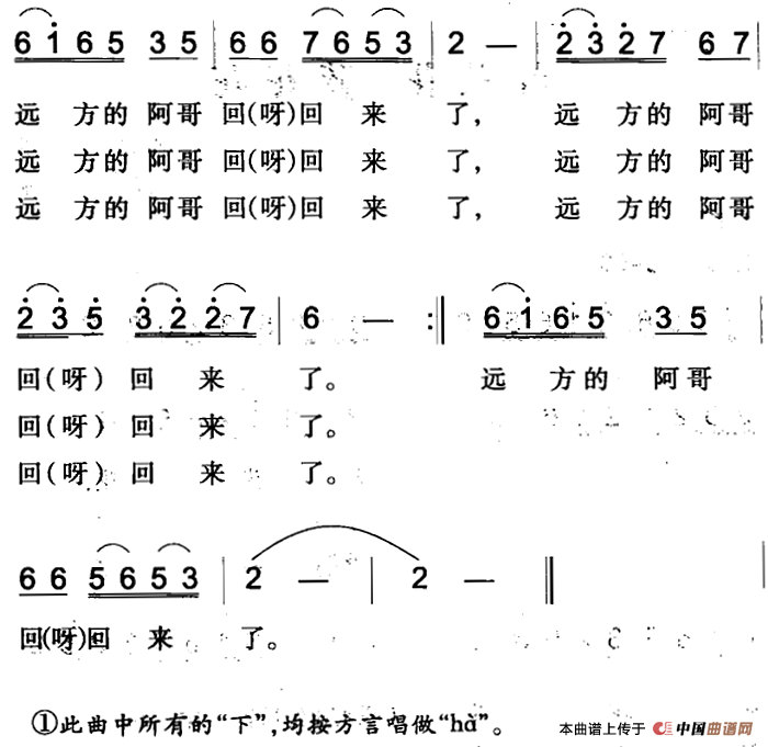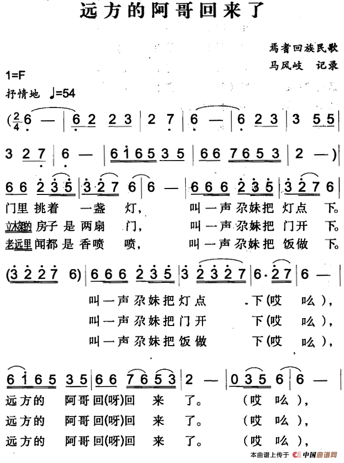 《远方的阿哥回来了(焉耆回族民歌)》简谱