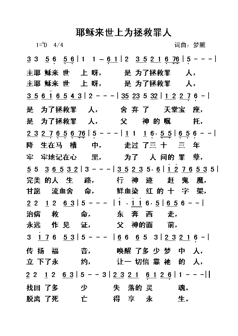 《耶稣来世上为拯救罪人》简谱 梦醒