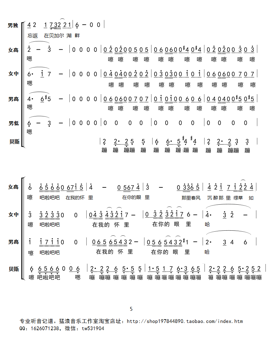《贝加尔湖畔四声部合唱谱》简谱 李健第5张