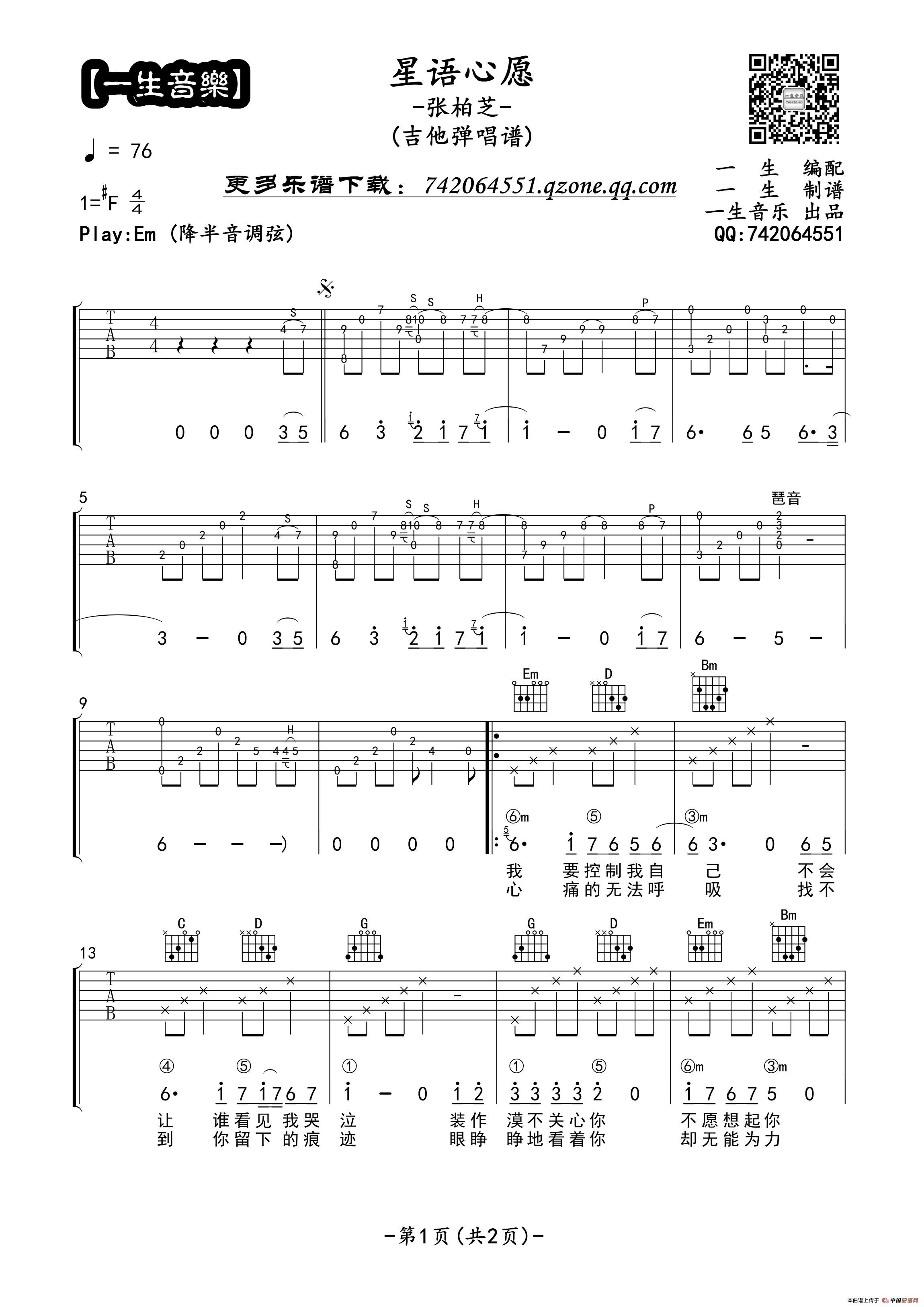 《星语心愿(一生音乐编配版)》简谱 张柏芝