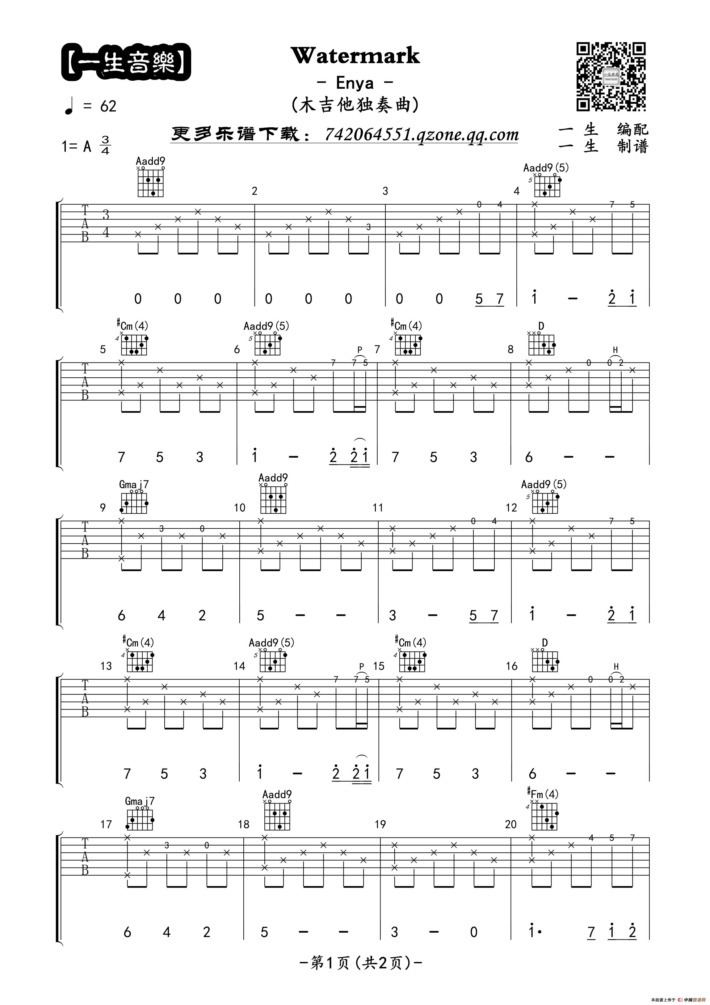 《Watermark(吉他指弹独奏谱)》简谱 恩雅
