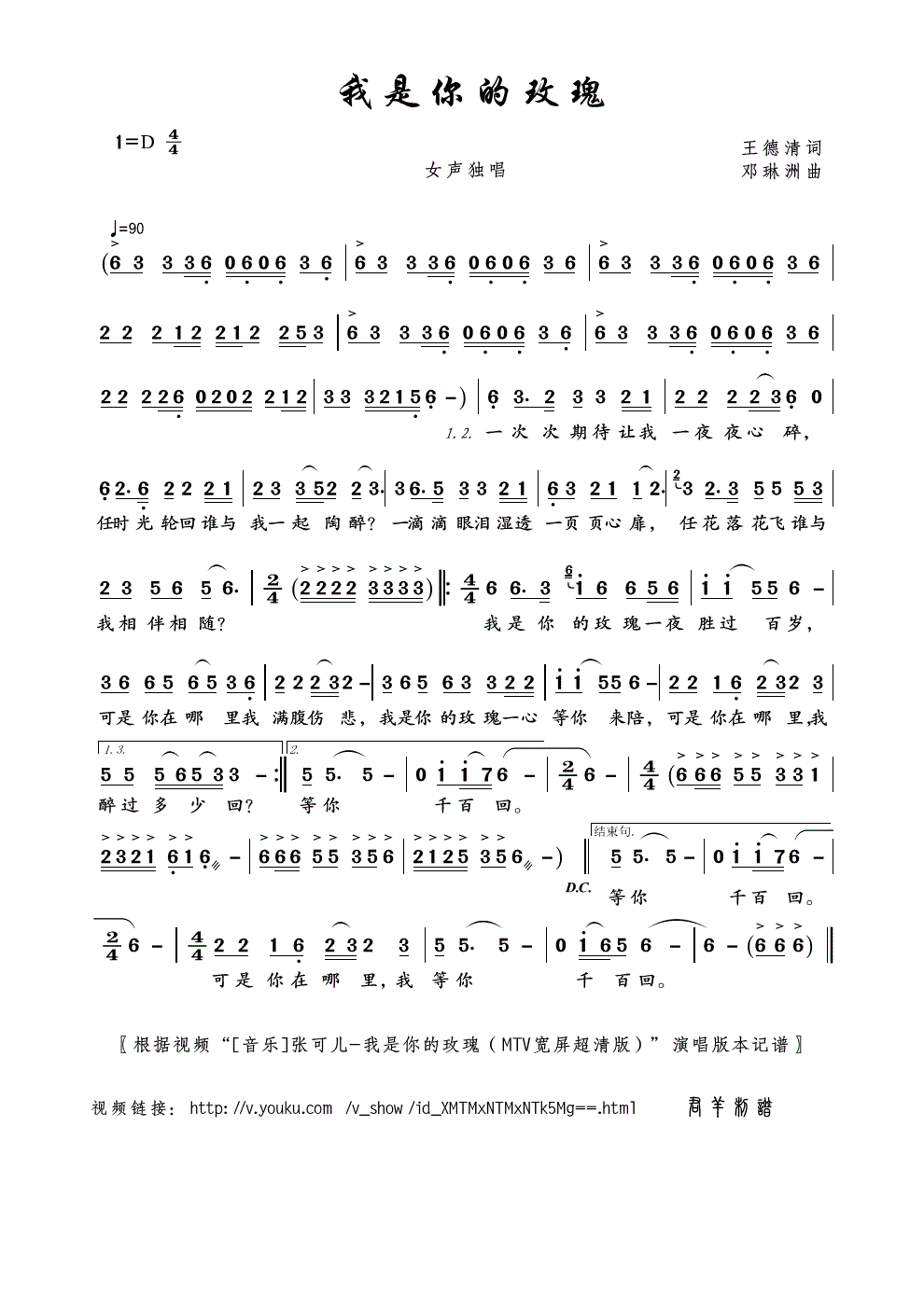 《我是你的玫瑰》简谱 张可儿