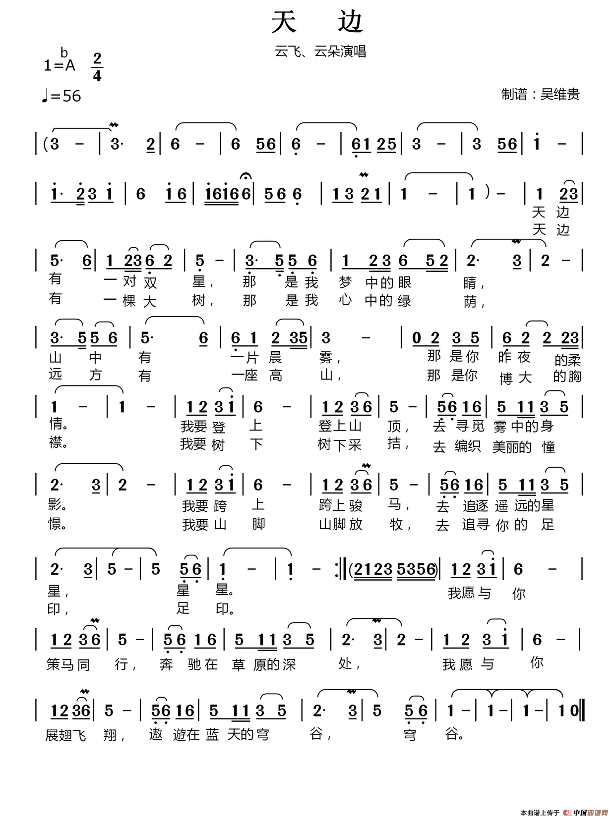 《天边》简谱 云飞 点这里