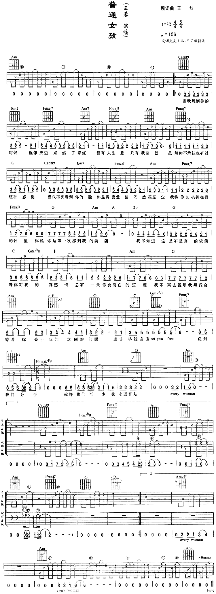 《普通女孩》吉他谱