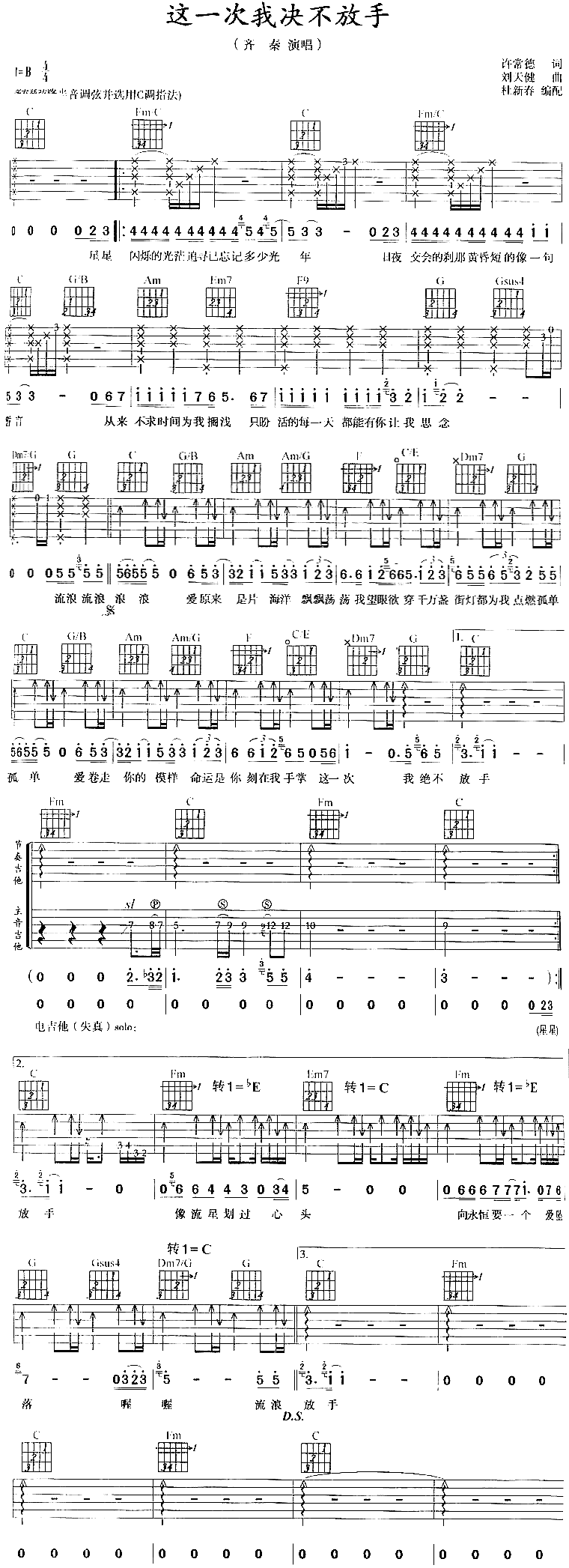 《这一次我决不放手》吉他谱 齐秦