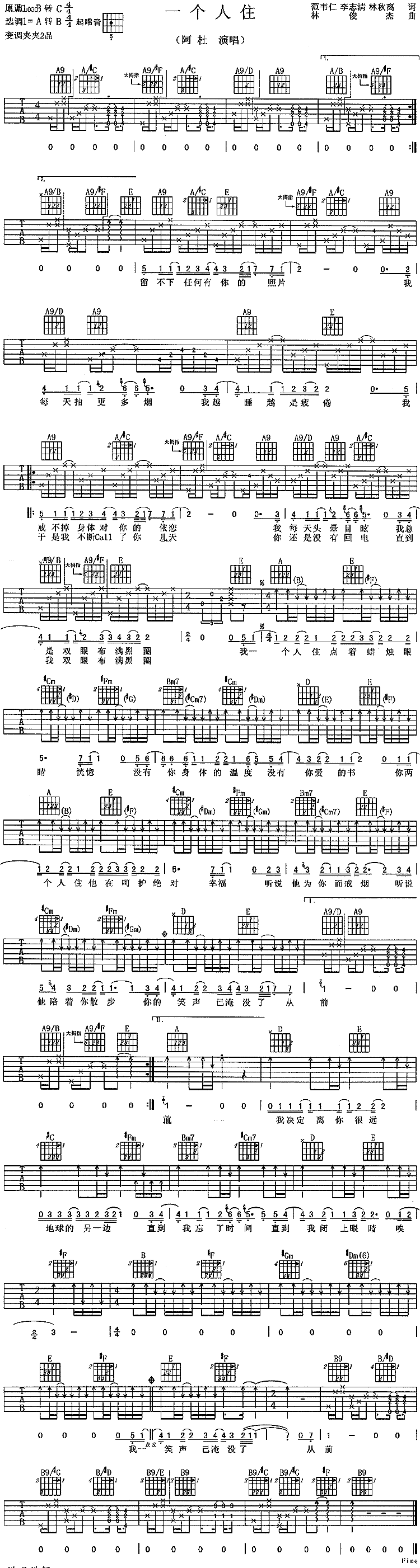《一个人住》吉他谱 阿杜