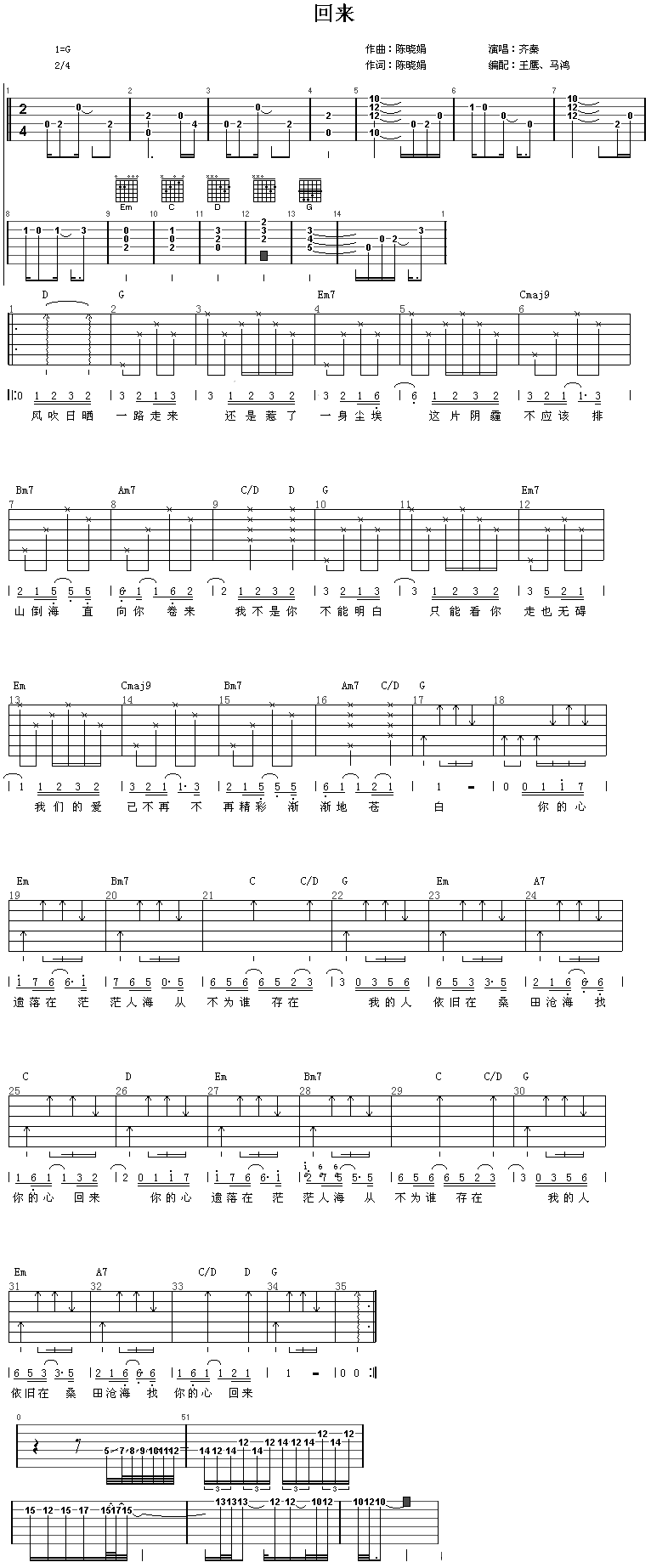 《回来》吉他谱 齐秦