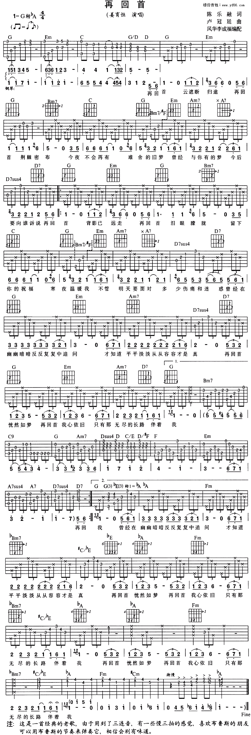 《再回首》吉他谱 姜育恒