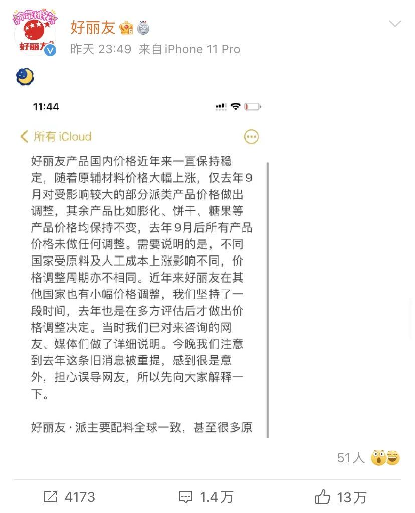(图:好丽友官微回应截图)“巧克力派”的疲态“好丽友,好朋友”曾是不少人耳熟能详的广告词。 本公司董事会及全体董事保证本公告内容不存在任何虚假记载、误导性陈述或者重大遗漏,并对其内容的真实性、准确性和完整性承担个别及连带责任。 回首“十四五”规划建议稿起草过程,其中一个重要特点,就在于坚持发扬民主、开门问策、集思广益。