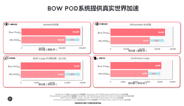 不仅如此,转换到实际模型中的吞吐量,与IPU POD64相比,在计算机视觉的ResNet50 和 EifficientNet-B4 训练模型中,Bow Pod64的吞吐量能够达到34%和39%的性能提升。