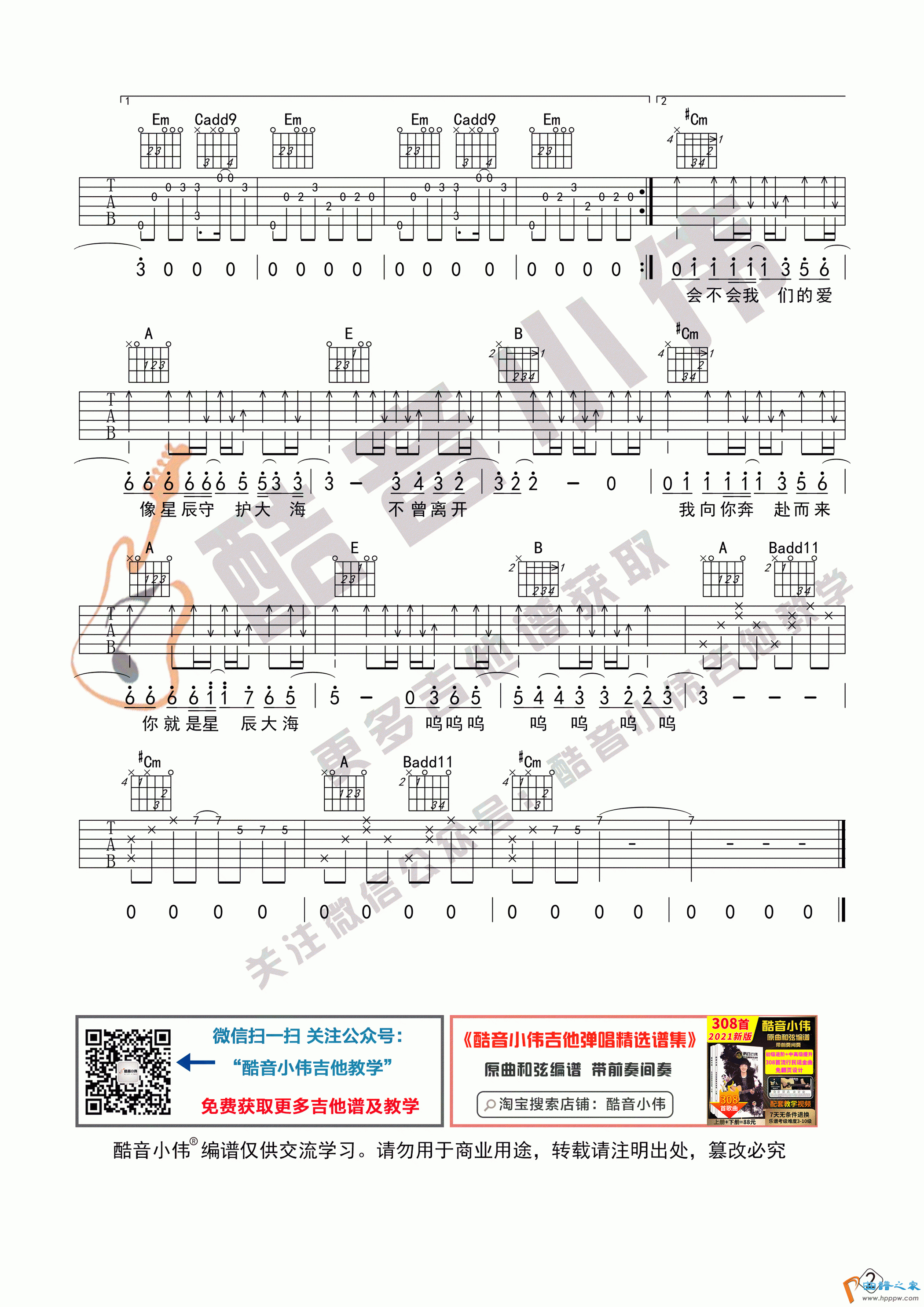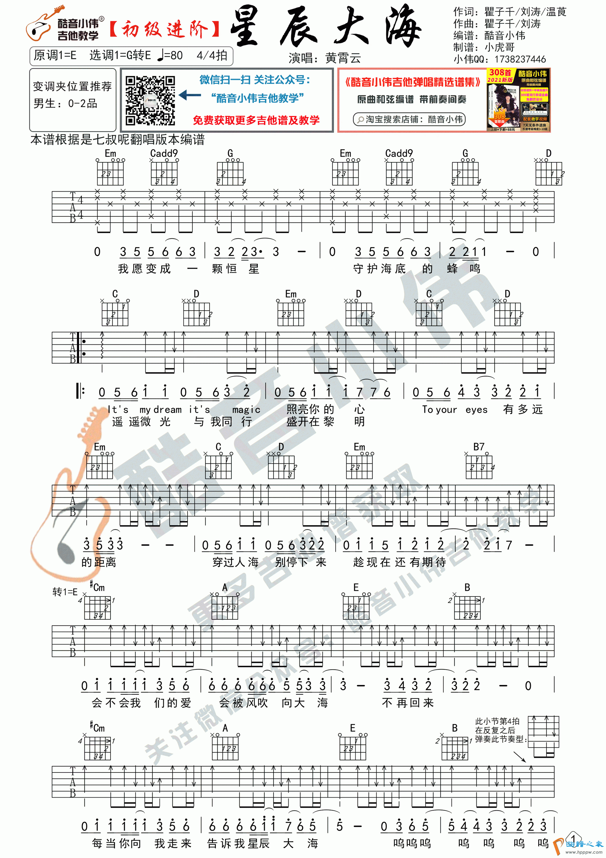 《星辰大海》吉他谱初级进阶版 带教学视频(酷音小伟吉他教学)