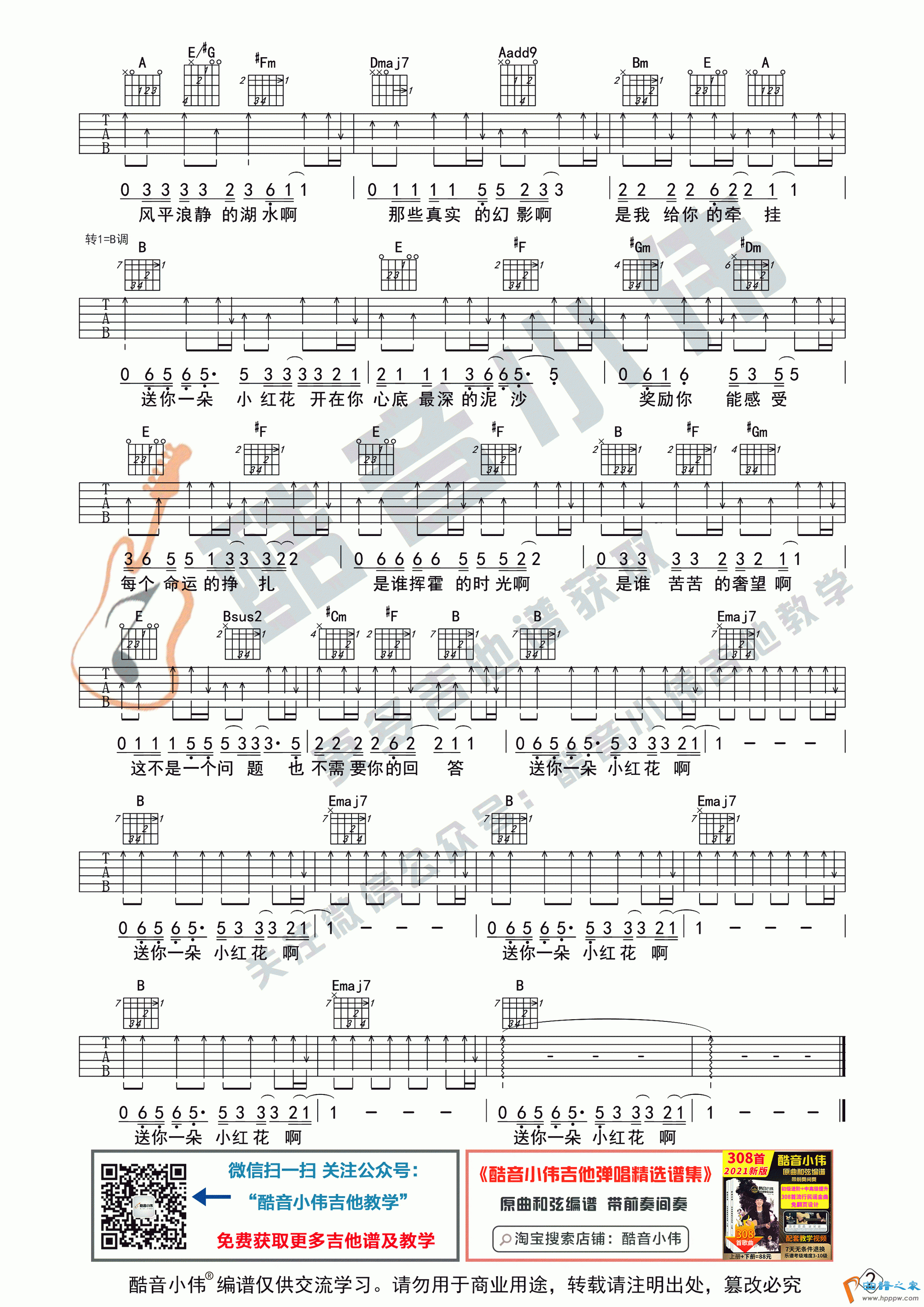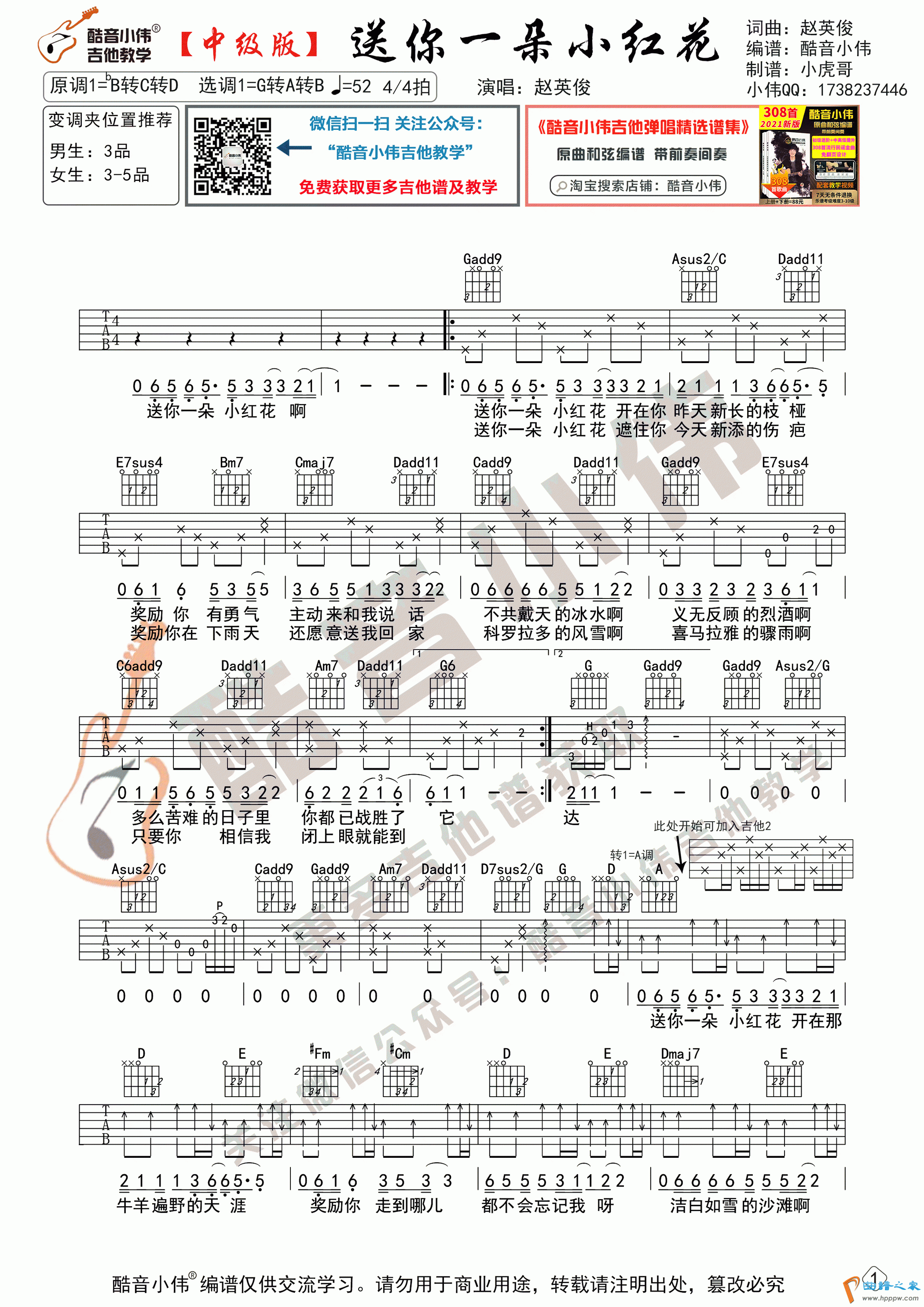 《送你一朵小红花》吉他谱中级版 带教学视频(酷音小伟吉他教学
