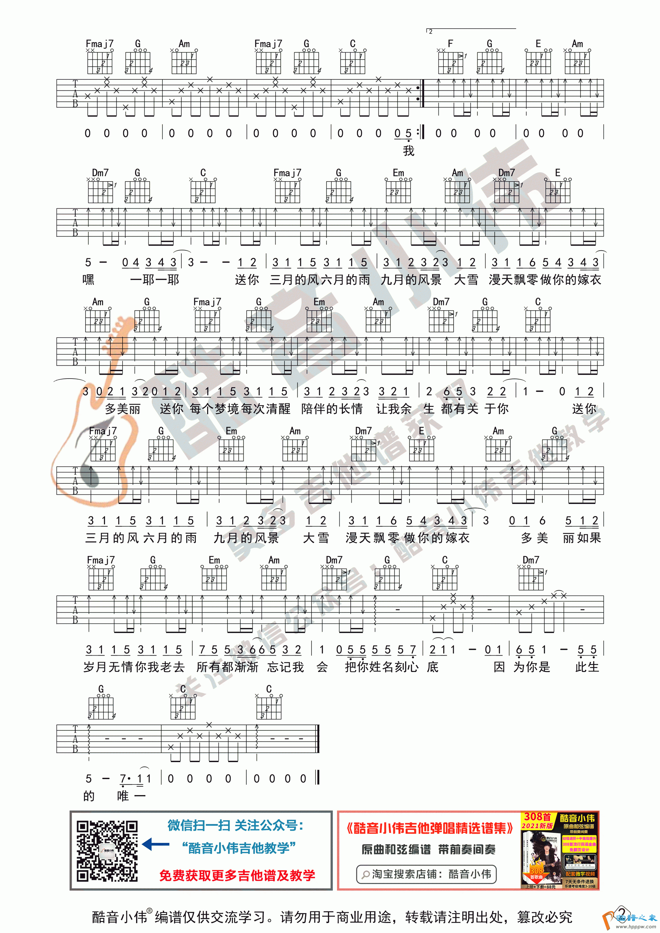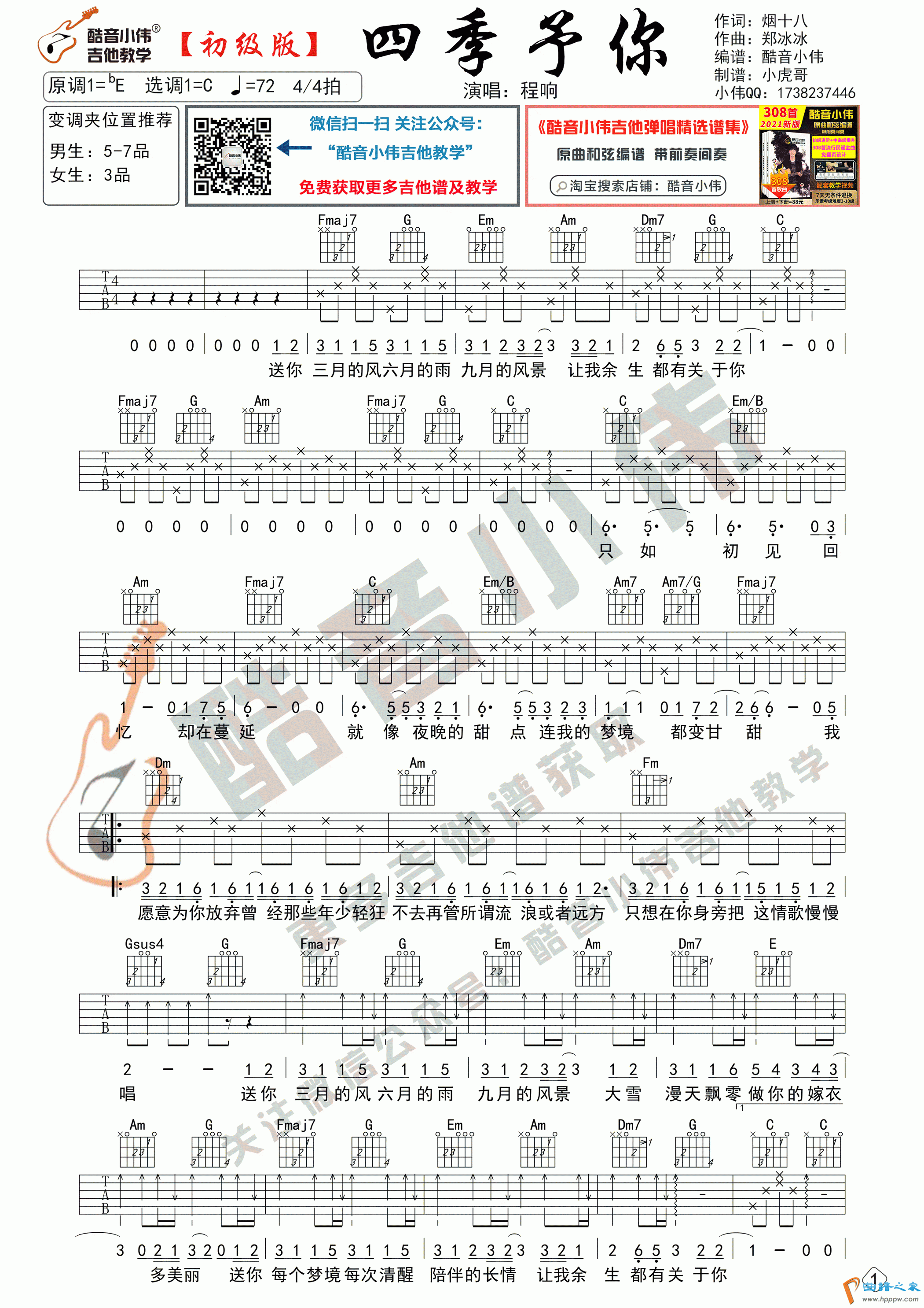 《四季予你》程响 吉他谱初级简单版(酷音小伟吉他教学)