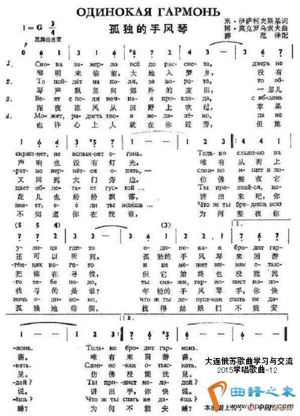 孤独的手风琴(ОДИНОКАЯ ГАРМОНЬ)(中俄简谱)