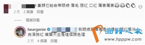 不过有部分网友质疑素颜的真实性,认为她明明有化眼线、腮红、眉毛和口红,还敢说没化妆,钓出熊熊本人解释:“我眼线跟眉毛是纹绣的,腮红是洗完澡脸红,嘴唇天生是这个颜色喔!”